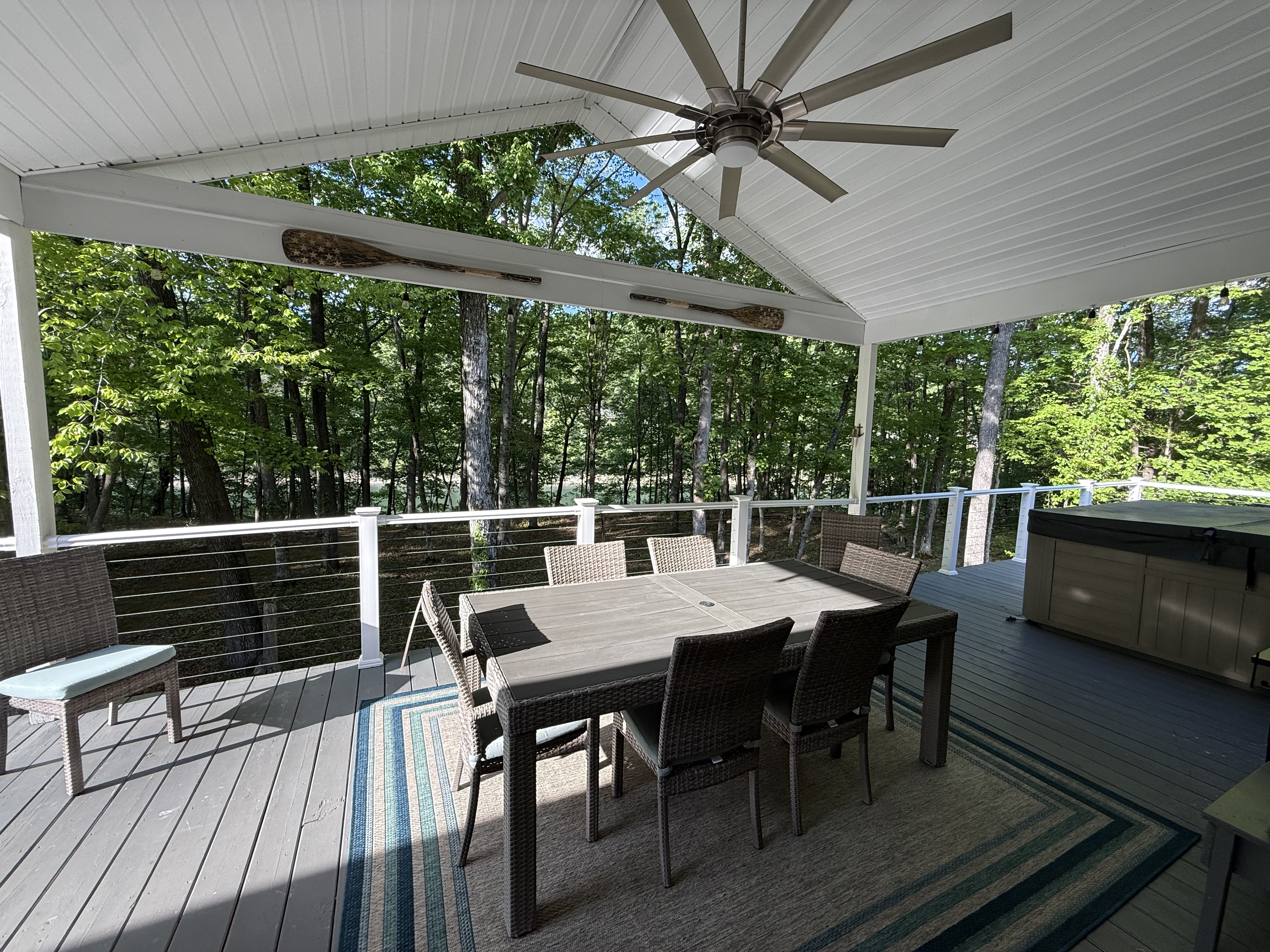 Unwind on our expansive deck that spans the full length of the home, overlooking the lake and woods. Soak in our year-round hot tub while enjoying breathtaking views and the peaceful sounds of nature.
